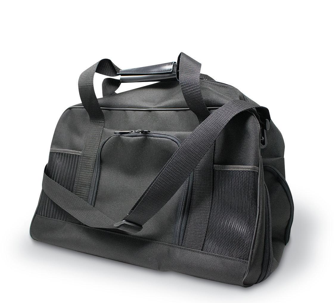 Top carry handles with leather handle wrap, front organizer pocket, 2 mesh pockets, shoe tunnel, adjustable/ removable shoulder strap with grip in 600D poly. Min. 50 ITEM# AS2083