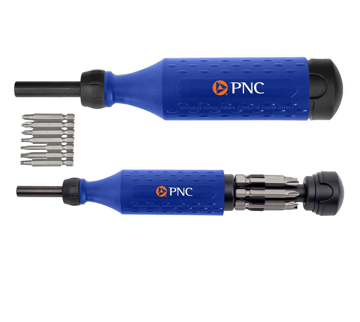 Loaded with 7 durable industrial grade steel bits at the end of tool. Includes Slot bit 6, Slot bit 4, Phillips bit 1, 2 & 3, Torx bit 15, Square bit 2 and Hex Nut Drive. Many colors avaiable, and can mix and match collar, handle and cap color. Min. 100.