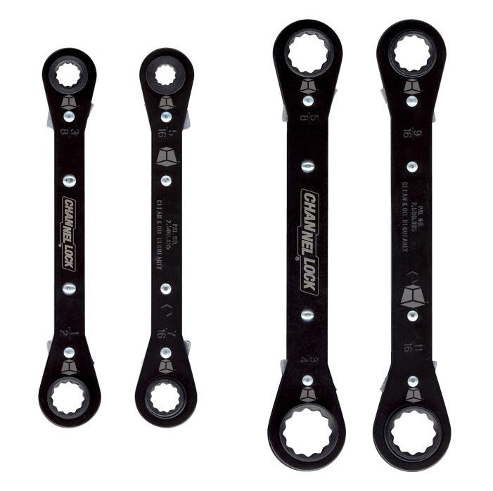 This 2-piece, 8-in-1 ratcheting/reversible box-end wrench set features a unique hollow socket design for added versatility. Perfect for deep well sockets or long bolts. With direction toggles on both ends, it allows for easy one-handed operation. Made in the USA with heat-treated steel for rust prevention. Min. 12.