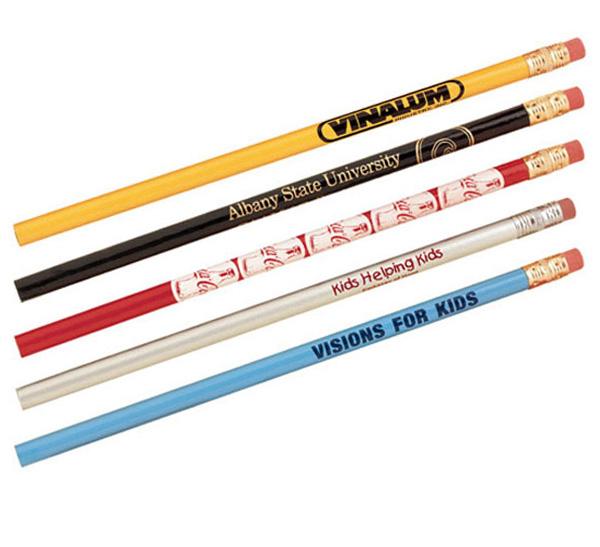 Round wood pencil with bright ferrule, soft rubber eraser, high-quality bonded lead. Many colors available. Min. 500.