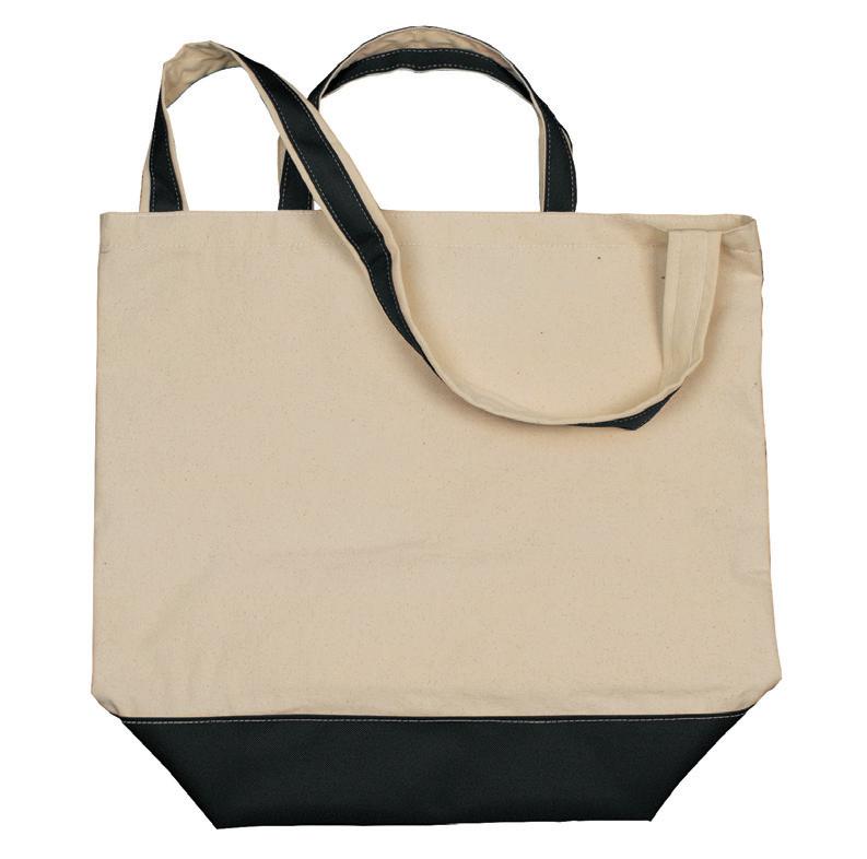18 1/2” W x 13 1/2” H x 7 1/4” D natural canvas tote with contrasting accent color on bottom and straps. Features double carrying handles and shoulder strap. Min. 100. ITEM# AS2111