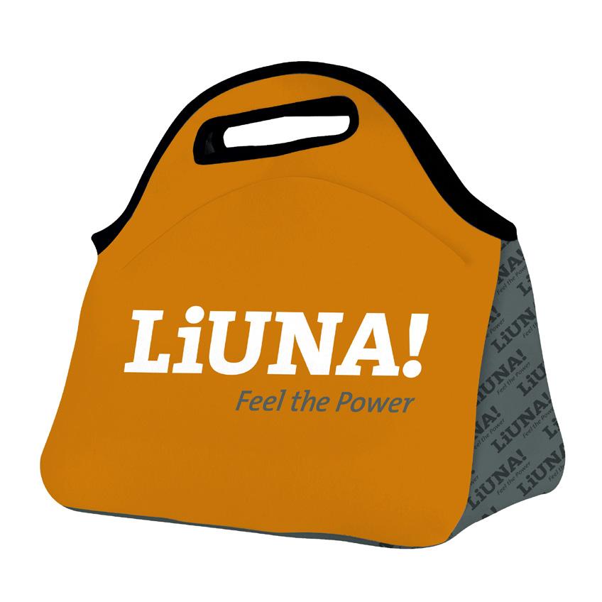 600 Denier Polyester lined with heat sealed, leak proof white vinyl. Mesh water bottle pocket on side. Insulated front pocket w/ shoulder strap. 13” x 11” x 8”. Min. 100. ITEM# AS900