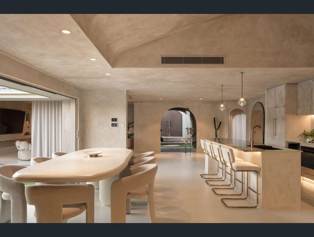 Over the course of five months in 2021, Ruin X underwent its stunning transformation, and since then, it has become a sought-after location for events and photo shoots by local brands and influencers alike Stepping through the curved entryway, adorned with majestic Canary palms, guests are greeted by glass doors featuring exquisite bronze snake handles, leading to a living area boasting Venetian plaster and captivating textural finishes