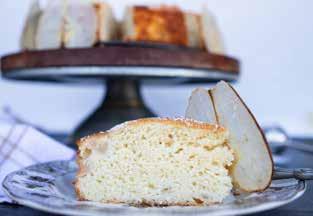 4. In a separate bowl, whisk together flour, baking powder and salt. Sift the dry ingredients into the wet mixture, stirring just until incorporated. Fold in the pear pieces with care to avoid overmixing.