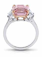From left to right: 3.36 carat cushion red ruby with 10 pear shape diamonds 0.98 carat 15.20 carat oval yellow sapphire with two elongated tappered baguette diamonds 11.29 carat vivid blue sapphire with two cushion brilliant diamonds at 1.03 carat 8.09 carat emerald cut pink sapphire ring with 0.89 carat french cut trapezoid diamonds