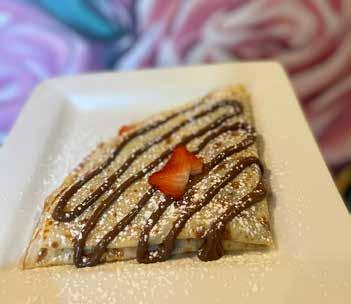 — featuring prosciutto, mozzarella cheese, tomato, spinach and balsamic pesto sauce — or perhaps Smoked Salmon — layered with lox salmon, capers, tomatoes, red onion and dill cream fraîche sauce. Those with sweet tooths may instead choose Lemon Curd — featuring The Village Coffee and Creperie’s house-made lemon curd, fresh berries, raspberry preserves and whipped cream — or Strawberry Lemon Meringue — boasting melted mini marshmallows, fresh strawberries and a tart lemon glaze.