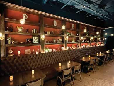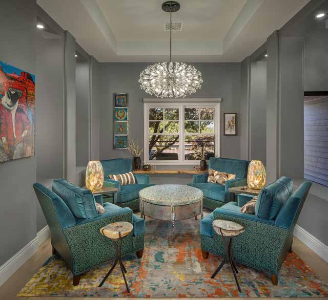 Once marked as a dining room on the original plans, this space has been reimagined into a refined sitting room — perfect for intimate gatherings and wine appreciation. Four plush chairs, upholstered in a rich mix of leather and velvet, encircle a custom Verde copper table with a leather top, offering both comfort and style.