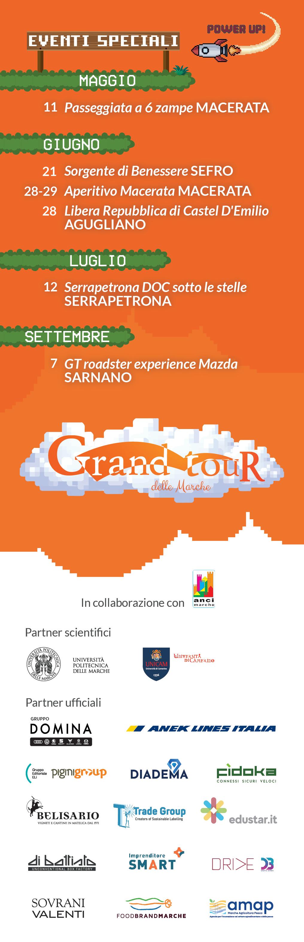 Tra gli eventi speciali, la passeggiata a sei zampe a Macerata, Sorgenti di Benessere a Sefro e poi gli speciali “Aperitivi”, di nuovo a Macerata. Da segnalare, il 28 giugno, l’evento “Libera Repubblica di Castel d’Emilio ad Agugliano”, uno spaccato di tradizioni e gusti veneti che rende omaggio al Grand Tour delle Marche. La notte nera a Serrapetrona e la GT roadster experience Mazda a Sarnano sono gli altri eventi speciali in calendario.