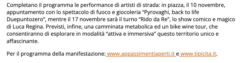 Completano il programma, momenti d’intrattenimento e divertimento, spettacoli con artisti di strada nei pomeriggi delle due domeniche, nonché una camminata metabolica ed un bike wine tour che consentiranno di godere in modalità “attiva e immersiva” questo territorio, unico e affascinante.