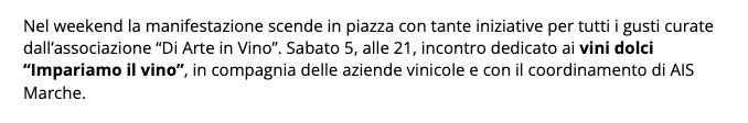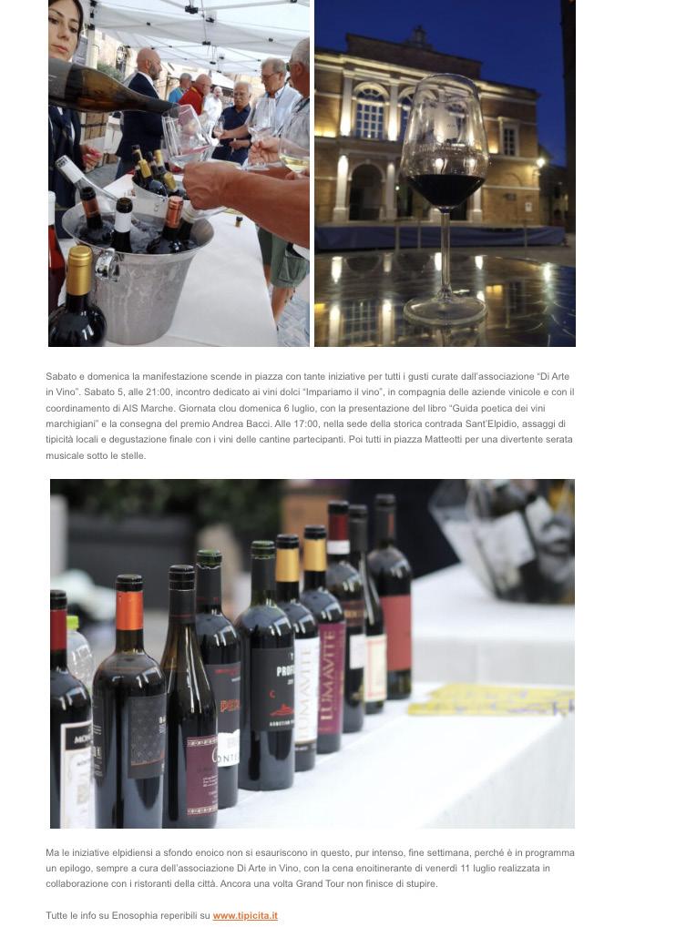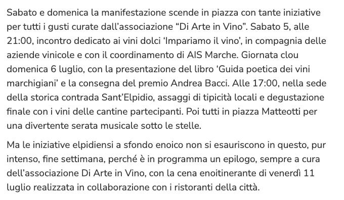 Sabato e domenica la manifestazione scende in piazza con tante iniziative per tutti i gusti curate dall’associazione “Di Arte in Vino”. Sabato 5, alle 21:00, incontro dedicato ai vini dolci “Impariamo il vino”, in compagnia delle aziende vinicole e con il coordinamento di AIS Marche. Giornata clou domenica 6 luglio, con la presentazione del libro “Guida poetica dei vini marchigiani” e la consegna del premio Andrea Bacci. Alle 17:00, nella sede della storica contrada Sant’Elpidio, assaggi di tipicità locali e degustazione finale con i vini delle cantine partecipanti. Poi tutti in piazza Matteotti per una divertente serata musicale sotto le stelle.