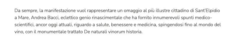 Da sempre, la manifestazione vuol rappresentare un omaggio al più illustre cittadino di Sant’Elpidio a Mare, Andrea Bacci, eclettico genio rinascimentale che ha fornito innumerevoli spunti medico-scientifici, ancor oggi attuali, riguardo a salute, benessere e medicina, spingendosi fino al mondo del vino, con il monumentale trattato De naturali vinorum historia