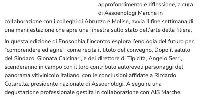 In questa edizione di Enosophia l’incontro esplora l’enologia del futuro per “comprendere ed agire”, come recita il titolo del convegno. Dopo il saluto del Sindaco, Gionata Calcinari, e del direttore di Tipicità, Angelo Serri, scenderanno in campo con il loro contributo autorevoli personaggi del panorama vitivinicolo italiano, con le conclusioni affidate a Riccardo Cotarella, presidente nazionale di Assoenologi. A seguire una degustazione professionale gestita in collaborazione con AIS Marche.