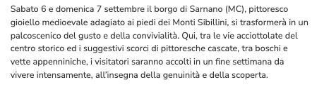 Sabato 6 e domenica 7 settembre il borgo di Sarnano (MC), pittoresco gioiello medioevale adagiato ai piedi dei Monti Sibillini, si trasformerà in un palcoscenico del gusto e della convivialità. Qui, tra le vie acciottolate del centro storico ed i suggestivi scorci di pittoresche cascate, tra boschi e vette appenniniche, i visitatori saranno accolti in un fine settimana da vivere intensamente, all’insegna della genuinità e della scoperta.