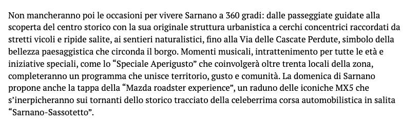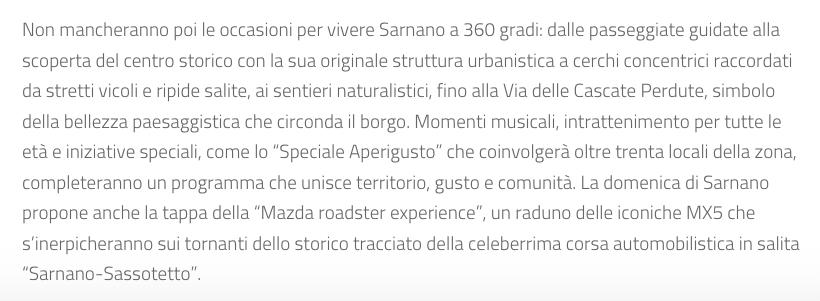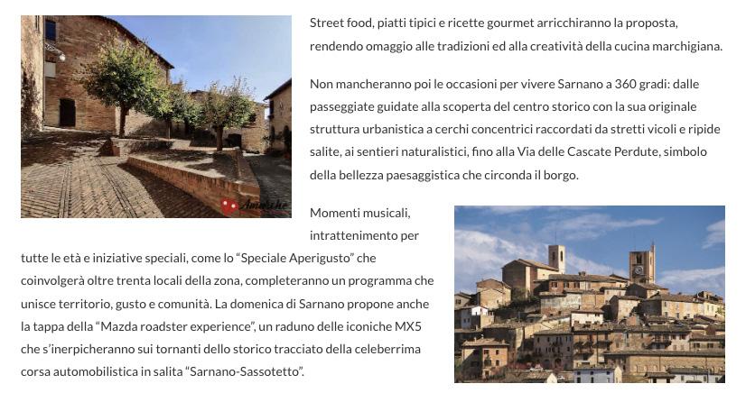 Non mancheranno poi le occasioni per vivere Sarnano a 360 gradi: dalle passeggiate guidate alla scoperta del centro storico con la sua originale struttura urbanistica a cerchi concentrici raccordati da stretti vicoli e ripide salite, ai sentieri naturalistici, fino alla Via delle Cascate Perdute, simbolo della bellezza paesaggistica che circonda il borgo. Momenti musicali, intrattenimento per tutte le età e iniziative speciali, come lo “Speciale Aperigusto” che coinvolgerà oltre trenta locali della zona, completeranno un programma che unisce territorio, gusto e comunità. La domenica di Sarnano propone anche la tappa della “Mazda roadster experience”, un raduno delle iconiche MX5 che s’inerpicheranno sui tornanti dello storico tracciato della celeberrima corsa automobilistica in salita “Sarnano-Sassotetto”.