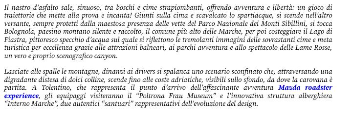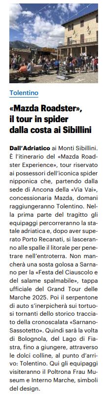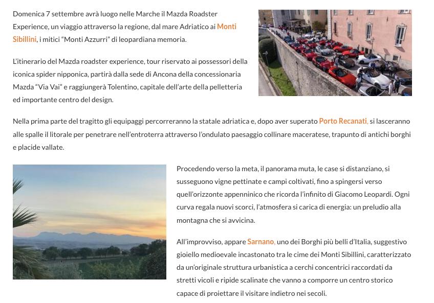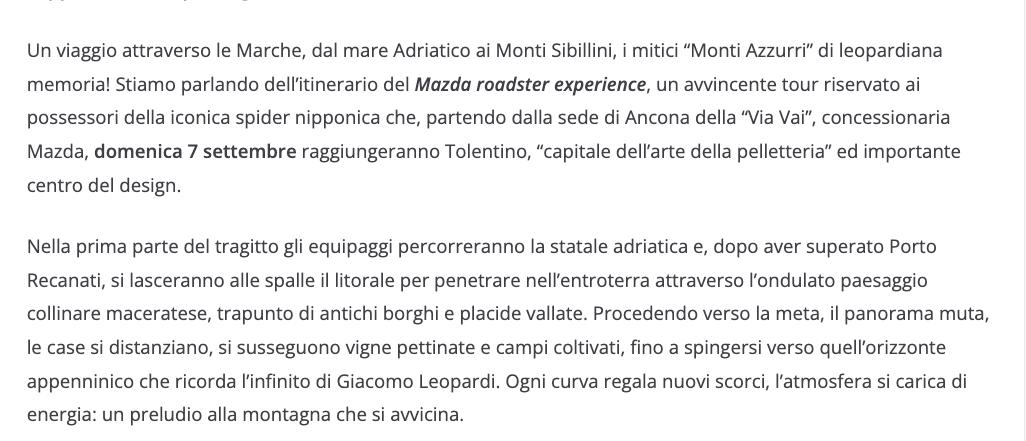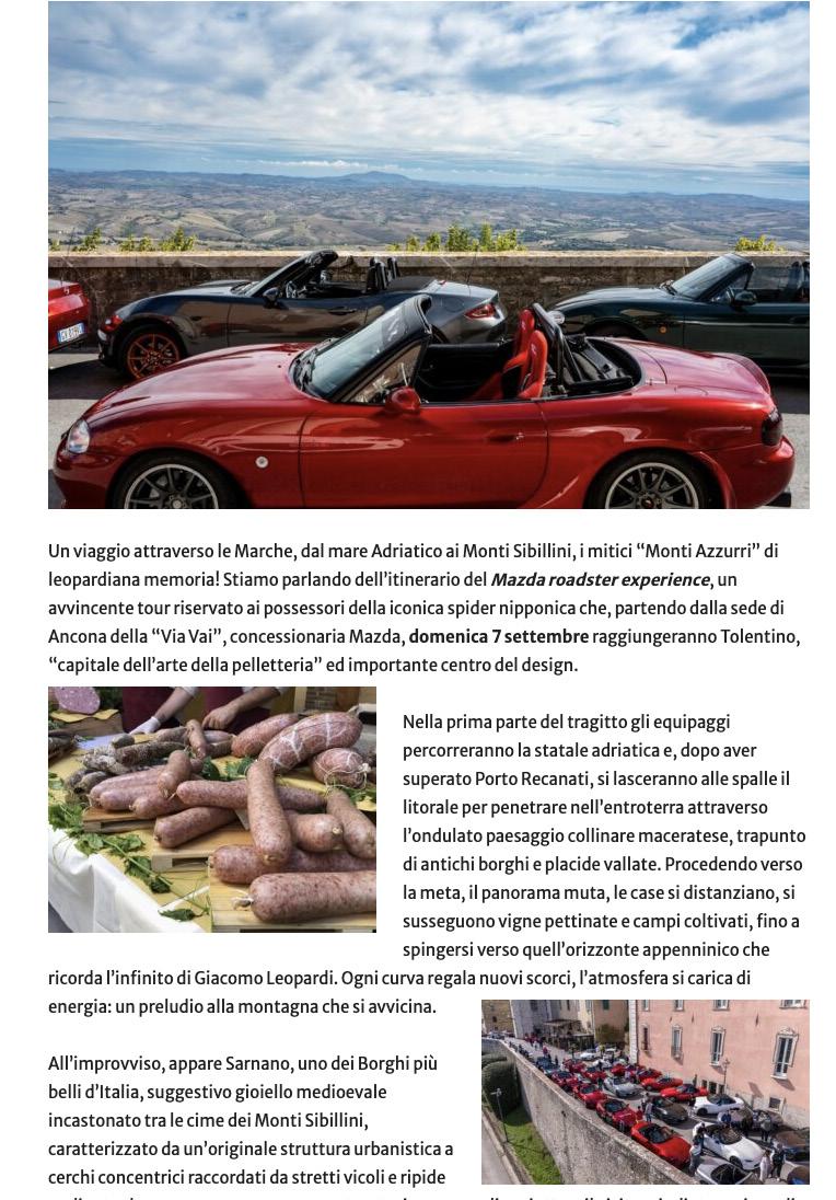 Un viaggio attraverso le Marche, dal mare Adriatico ai Monti Sibillini, i mitici “Monti Azzurri” di leopardiana memoria! Stiamo parlando dell’itinerario del Mazda roadster experience, un avvincente tour riservato ai possessori della iconica spider nipponica che, partendo dalla sede di Ancona della “Via Vai”, concessionaria Mazda, domenica 7 settembre raggiungeranno Tolentino, “capitale dell’arte della pelletteria” ed importante centro del design.
