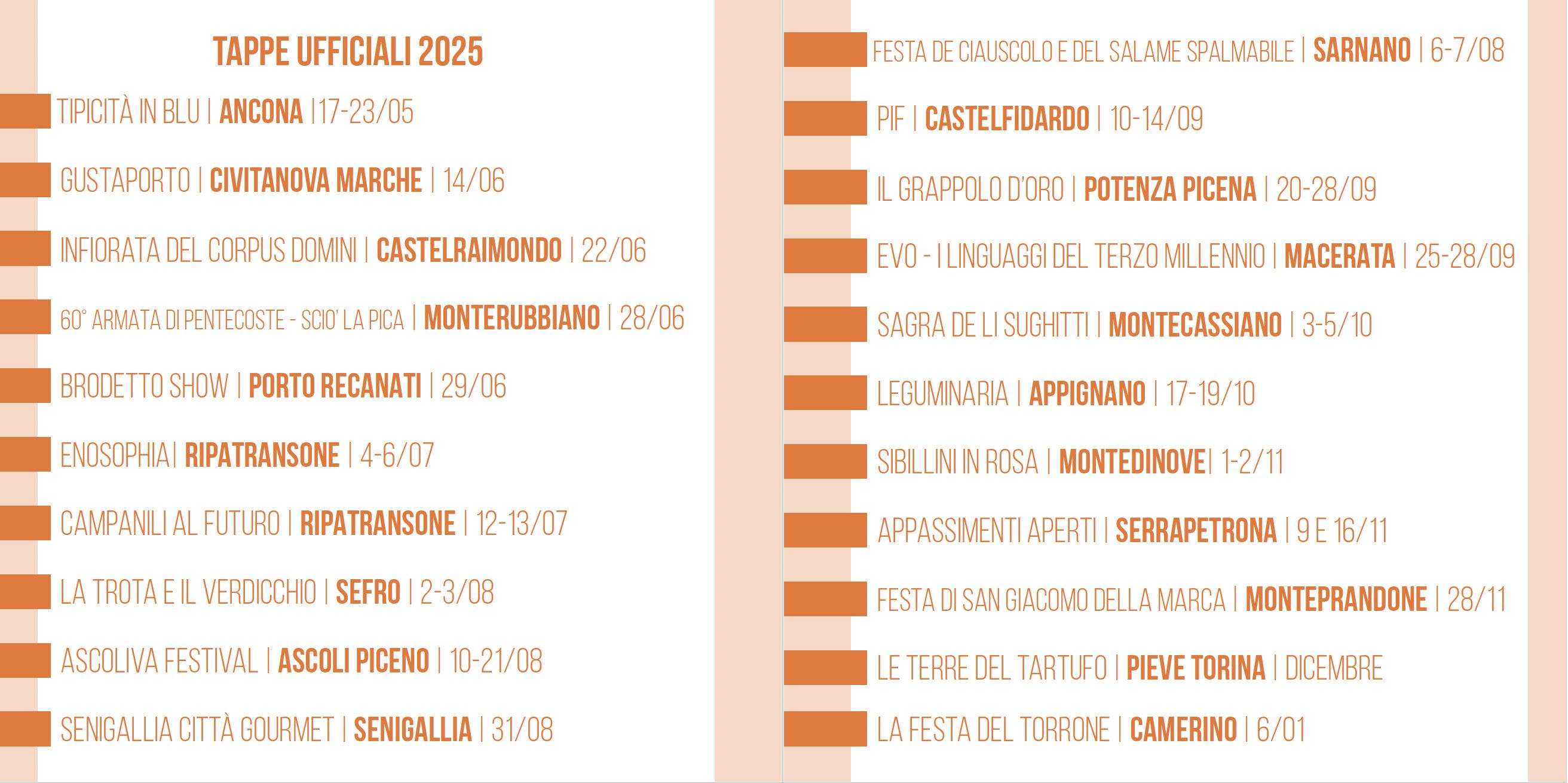 Dopo il prologo di Tipicità Festival a Fermo nel marzo scorso, a maggio è di scena Tipicità in Blu ad Ancona, mentre giugno si presenta con GustaPorto a Civitanova Marche e l’Infiorata di Castelraimondo. A chiudere il mese che dà avvio all’estate, Monterubbiano con Sciò la Pica e Porto Recanati con Brodetto Show.