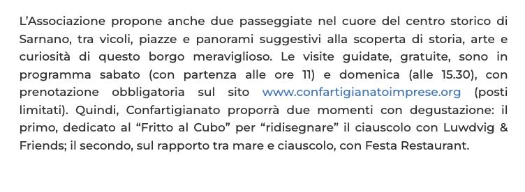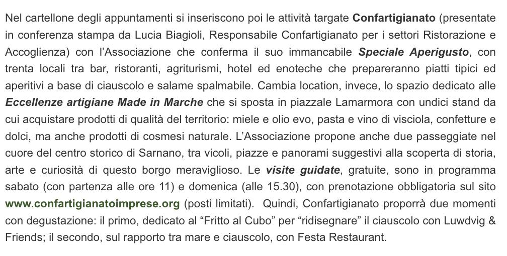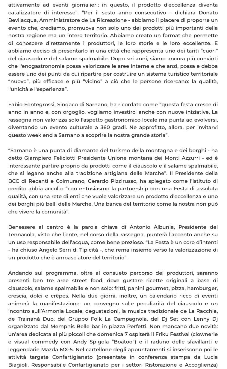 La festa offrirà un percorso esperienziale che propone degustazioni, incontri, show cooking e musica, con la possibilità di assaporare le eccellenze dei produttori locali ed esplorare le infinite declinazioni del ciauscolo, anche in abbinamento ai vini del territorio, a birre artigianali ed a creativi, quanto gustosi, cocktail. Street food, piatti tipici e ricette gourmet arricchiranno la proposta, rendendo omaggio alle tradizioni ed alla creatività della cucina marchigiana.