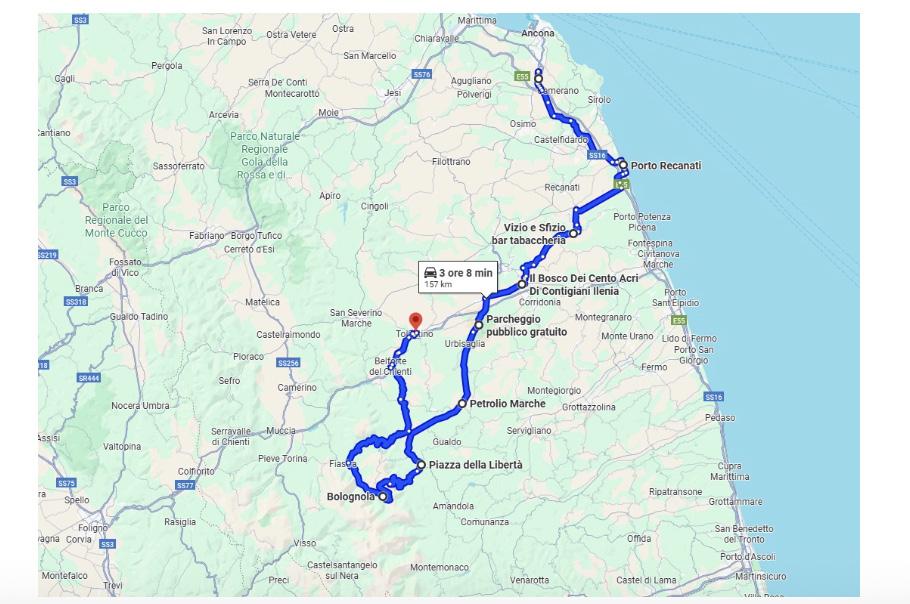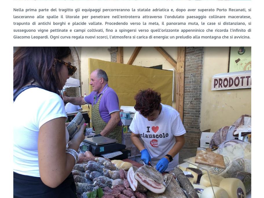 Nella prima parte del tragitto gli equipaggi percorreranno la statale adriatica e, dopo aver superato Porto Recanati, si lasceranno alle spalle il litorale per penetrare nell’entroterra attraverso l’ondulato paesaggio collinare maceratese, trapunto di antichi borghi e placide vallate. Procedendo verso la meta, il panorama muta, le case si distanziano, si susseguono vigne pettinate e campi coltivati, fino a spingersi verso quell’orizzonte appenninico che ricorda l’infinito di Giacomo Leopardi. Ogni curva regala nuovi scorci, l’atmosfera si carica di energia: un preludio alla montagna che si avvicina.