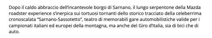 Dopo il caldo abbraccio dell’incantevole borgo di Sarnano, il lungo serpentone della Mazda roadster experience s’inerpica sui tortuosi tornanti dello storico tracciato della celeberrima cronoscalata “SarnanoSassotetto”, teatro di memorabili gare automobilistiche valide per i campionati italiani ed europei della montagna, ma anche del Giro d’Italia, sia di bici che di auto.