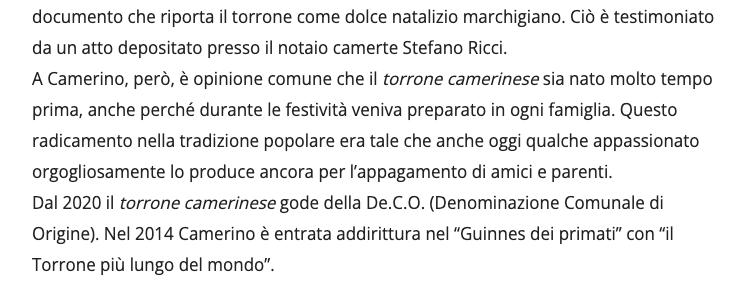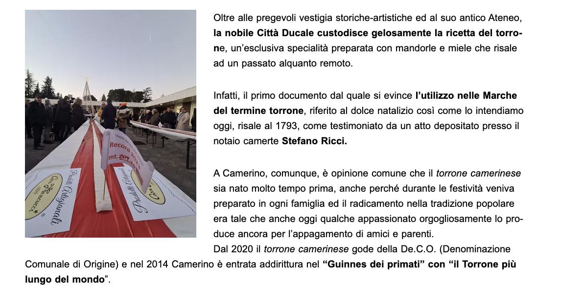 Dal 2020 il torrone camerinese gode della De.C.O. (Denominazione Comunale di Origine) e nel 2014 Camerino è entrata addirittura nel “Guinnes dei primati” con “il Torrone più lungo del mondo”.