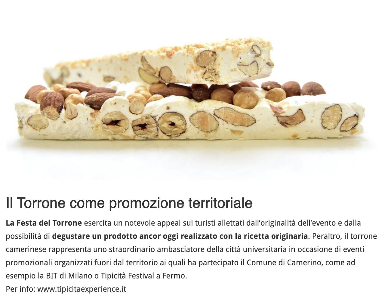 allettati dall’originalità dell’evento e dalla possibilità di degustare un prodotto ancor oggi realizzato con la segretissima ricetta originaria. Peraltro, il torrone camerinese rappresenta uno straordinario ambasciatore della città universitaria in occasione di eventi promozionali organizzati fuori dal territorio ai quali ha partecipato il Comune di Camerino, come ad esempio la BIT di Milano o Tipicità Festival a Fermo.