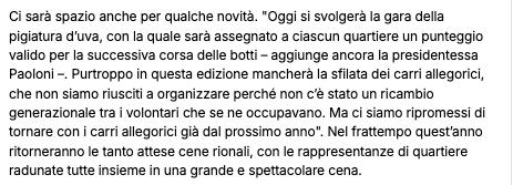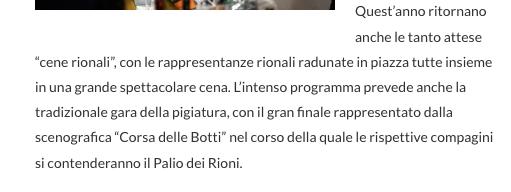 Quest’anno ritornano anche le tanto attese "cene rionali", con le rappresentanze rionali radunate in piazza tutte insieme in una grande spettacolare cena. L’intenso programma prevede anche la tradizionale gara della pigiatura, con il gran finale rappresentato dalla scenografica “Corsa delle Botti” nel corso della quale le rispettive compagini si contenderanno il Palio dei Rioni