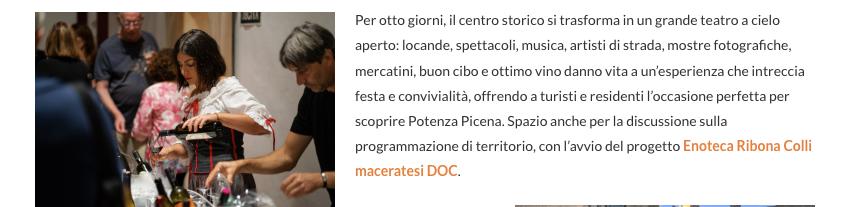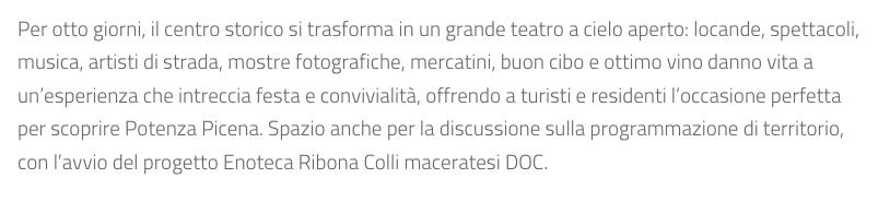 Per otto giorni, il centro storico si trasforma in un grande teatro a cielo aperto: locande, spettacoli, musica, artisti di strada, mostre fotografiche, mercatini, buon cibo e ottimo vino danno vita a un’esperienza che intreccia festa e convivialità, offrendo a turisti e residenti l’occasione perfetta per scoprire Potenza Picena. Spazio anche per la discussione sulla programmazione di territorio, con l’avvio del progetto Enoteca Ribona Colli maceratesi DOC.