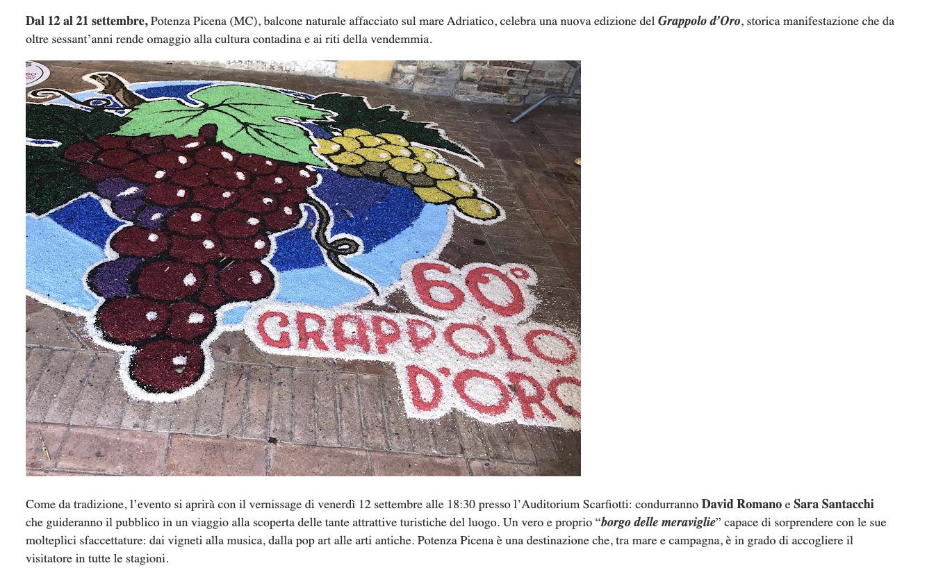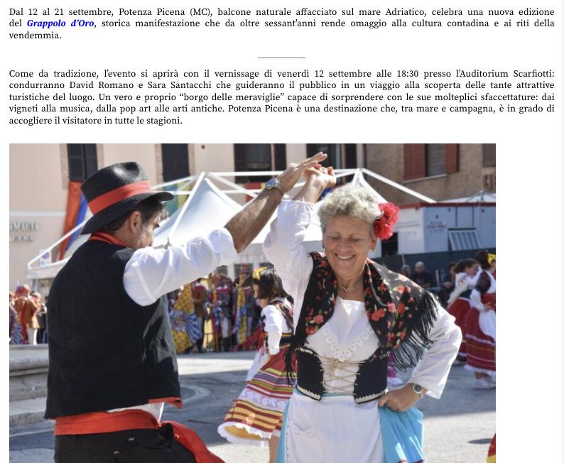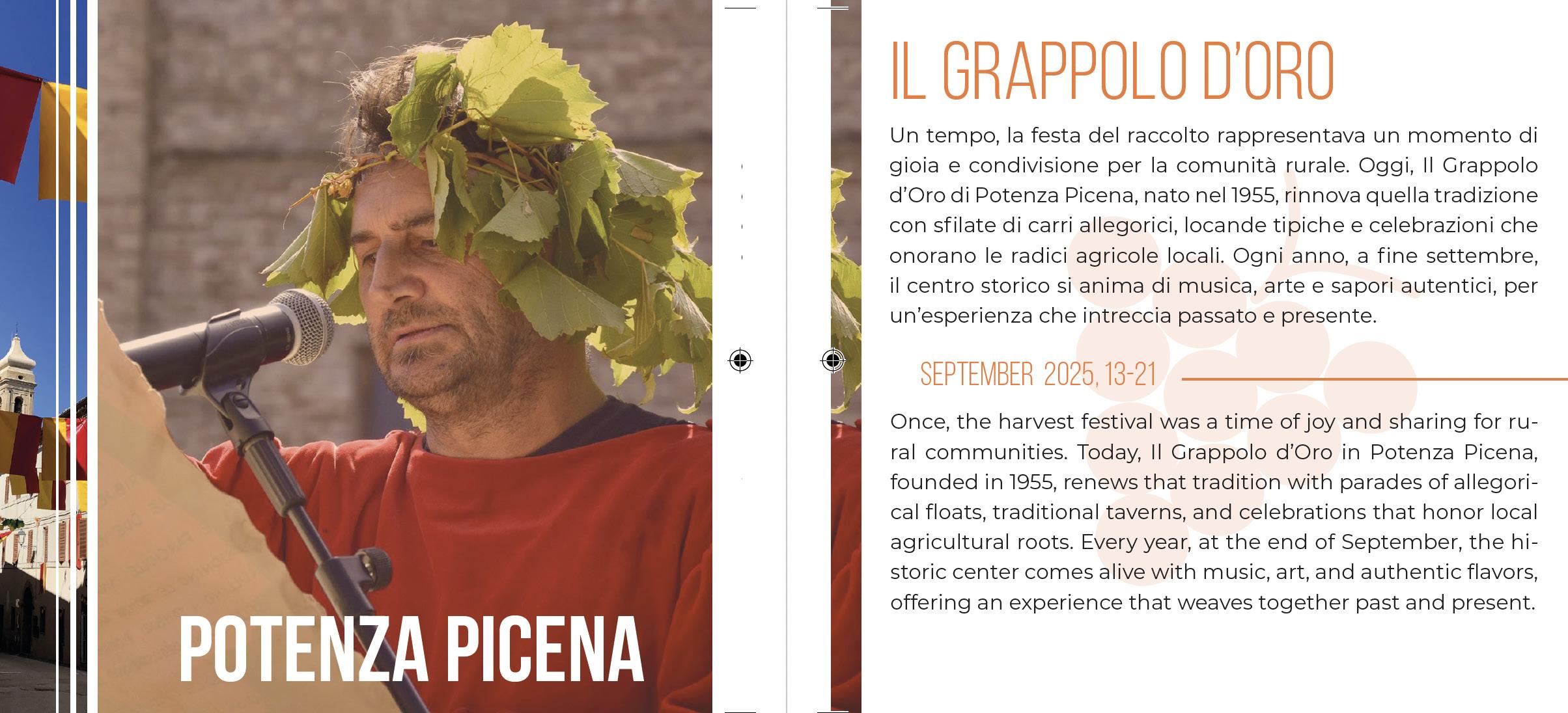 Dal 13 al 21 settembre, Potenza Picena (MC), balcone naturale affacciato sul mare Adriatico, celebra una nuova edizione del Grappolo d’Oro, storica manifestazione che da oltre sessant’anni rende omaggio alla cultura contadina e ai riti della vendemmia.