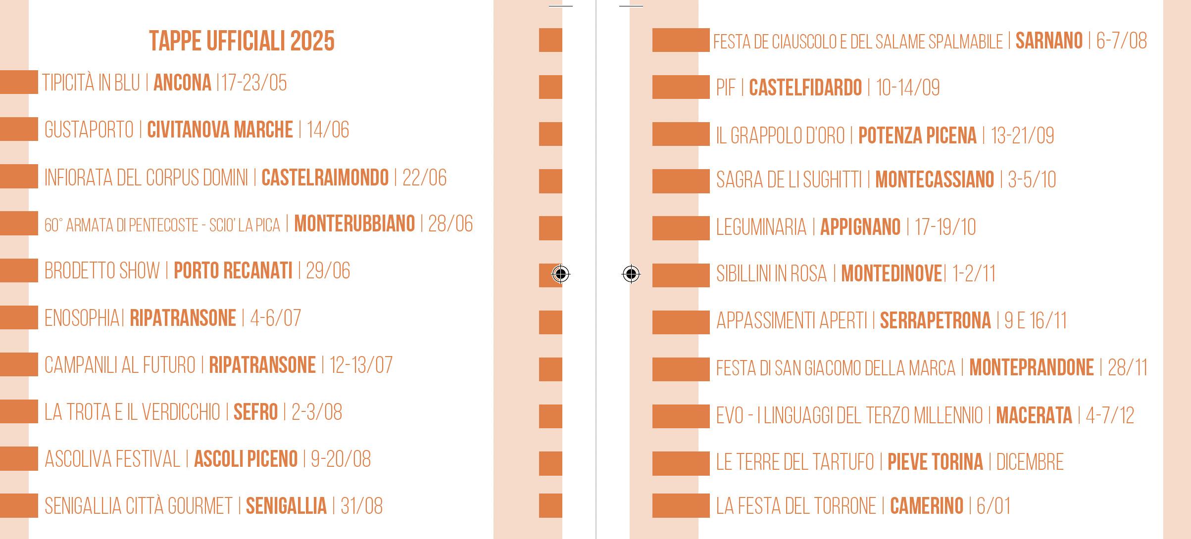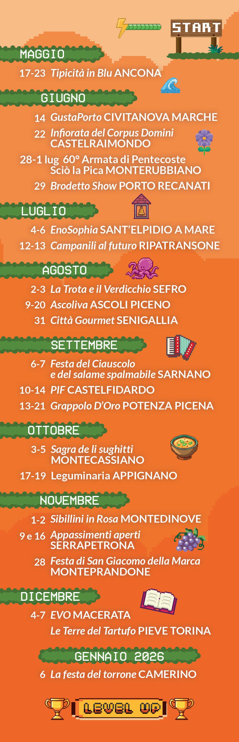 Dopo il prologo di Tipicità Festival a Fermo nel marzo scorso, a maggio è di scena Tipicità in Blu ad Ancona, mentre giugno si presenta con GustaPorto a Civitanova Marche e l’Infiorata di Castelraimondo. A chiudere il mese che dà avvio all’estate, Monterubbiano con Sciò la Pica e Porto Recanati con Brodetto Show.