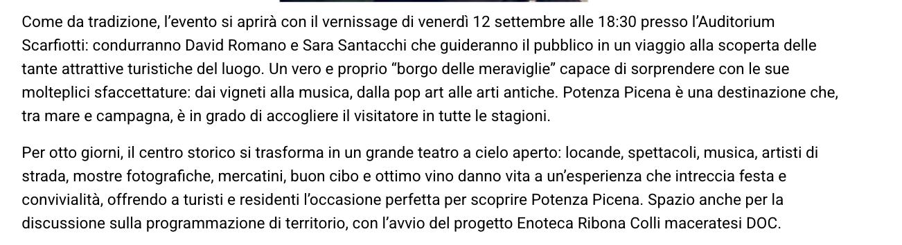 Come da tradizione, l’evento si aprirà con il vernissage di venerdì 12 settembre alle 18 :30 presso l’Auditorium Scarfiotti: condurranno David Romano e Sara Santacchi che guideranno il pubblico in un viaggio alla scoperta delle tante attrattive turistiche del luogo. Un vero e proprio “borgo delle meraviglie” capace di sorprendere con le sue molteplici sfaccettature: dai vigneti alla musica, dalla pop art alle arti antiche. Potenza Picena è una destinazione che, tra mare e campagna, è in grado di accogliere il visitatore in tutte le stagioni