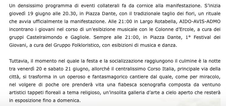 Tuttavia, il momento nel quale la festa e la socializzazione raggiungono il culmine è la notte tra venerdì 20 e sabato 21 giugno, allorché il centralissimo Corso Italia, principale via della città, si trasforma in un operoso e fantasmagorico cantiere dal quale, come per miracolo, nel volgere di poche ore prenderà vita una fiabesca scenografia composta da ventuno artistici tappeti floreali a tema religioso, un’insolita galleria d’arte a cielo aperto che resterà in esposizione fino a domenica.