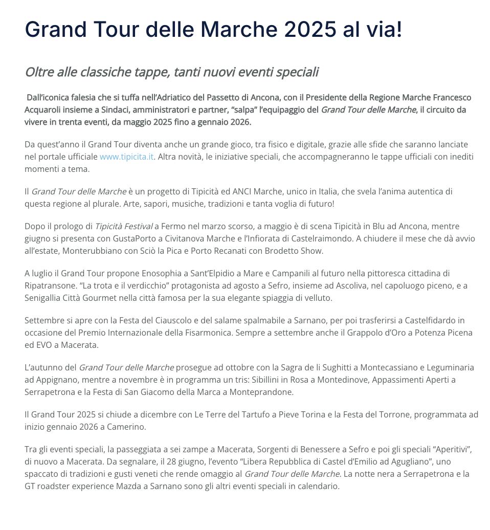 https://www.turismoitalianews.it/ultime/23889-marche-grand-tour-2025-al-via-varata-ufficialmente-l-edizione-n-12-oltre-alle-classiche-tappe-tanti-nuovi-eventi-speciali