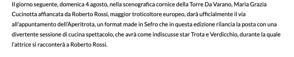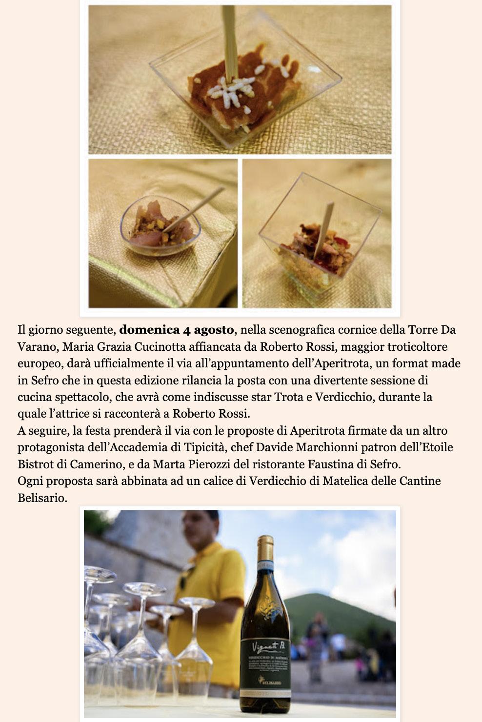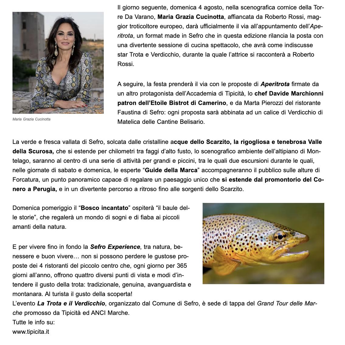 Il giorno seguente, domenica 4 agosto, nella scenografica cornice della Torre Da Varano, Maria Grazia Cucinotta affiancata da Roberto Rossi, maggior troticoltore europeo, darà ufficialmente il via all’appuntamento dell’Aperitrota, un format made in Sefro che in questa edizione rilancia la posta con una divertente sessione di cucina spettacolo, che avrà come indiscusse star Trota e Verdicchio, durante la quale l’attrice si racconterà a Roberto Rossi.