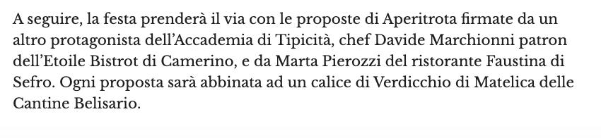A seguire, la festa prenderà il via con le proposte di Aperitrota firmate da un altro protagonista dell’Accademia di Tipicità, chef Davide Marchionni patron dell’Etoile Bistrot di Camerino, e da Marta Pierozzi del ristorante Faustina di Sefro. Ogni proposta sarà abbinata ad un calice di Verdicchio di Matelica delle Cantine Belisario.