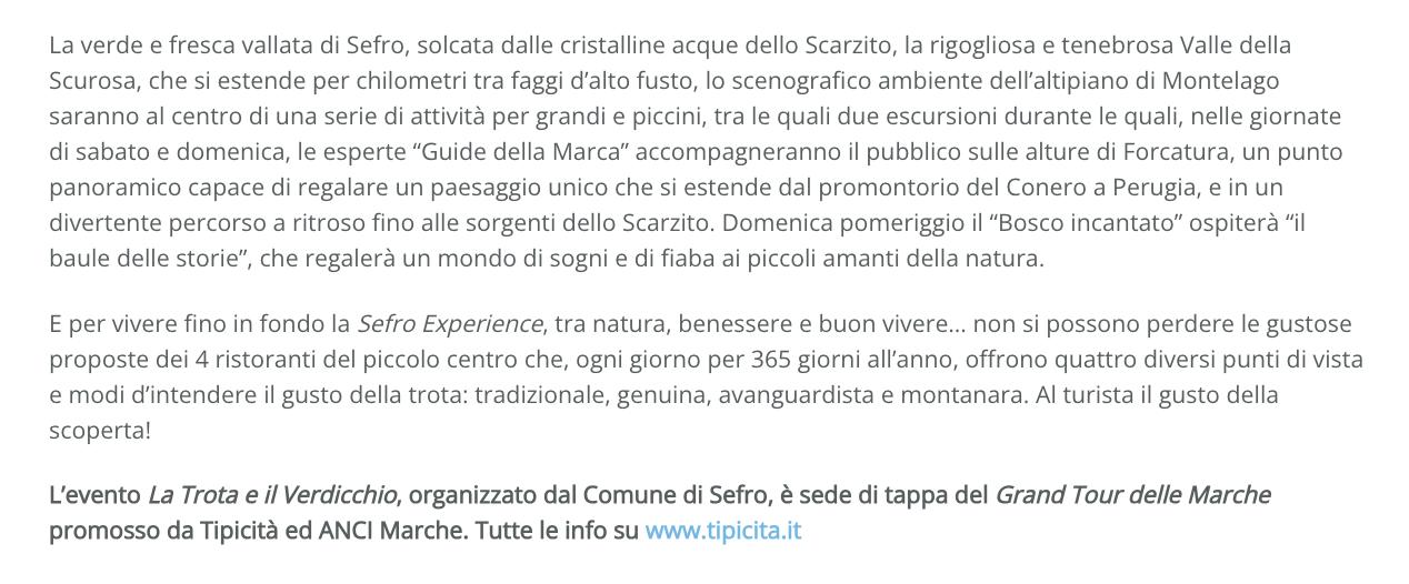 L’evento La Trota e il Verdicchio, organizzato dal Comune di Sefro, è sede di tappa del Grand Tour delle Marche promosso da Tipicità ed ANCI Marche. Tutte le info su www.tipicita.it.
