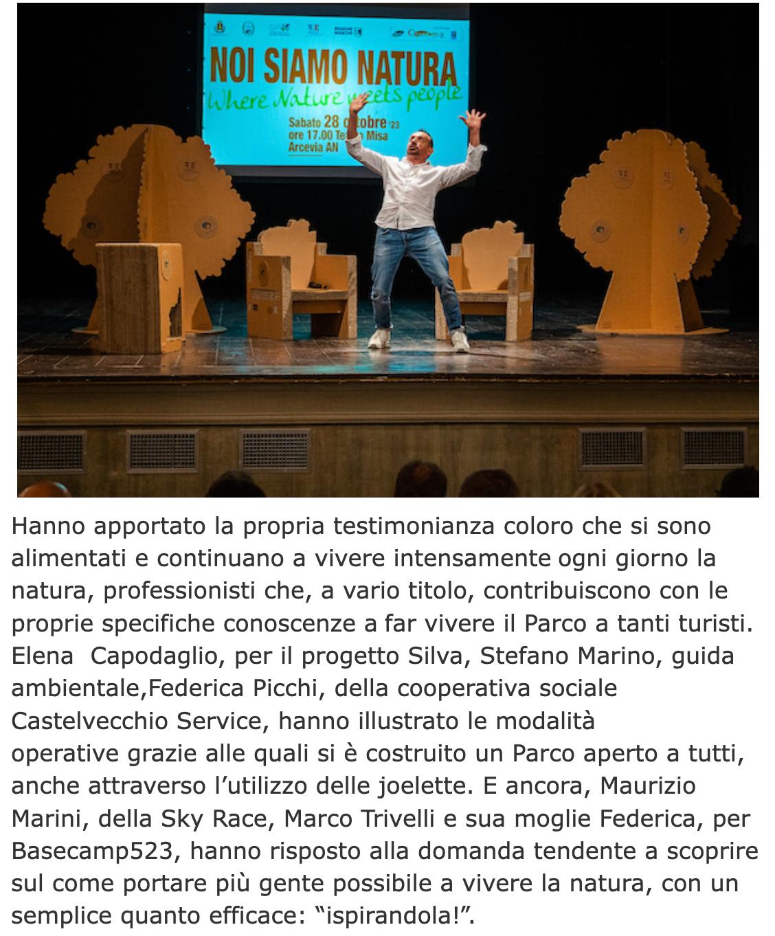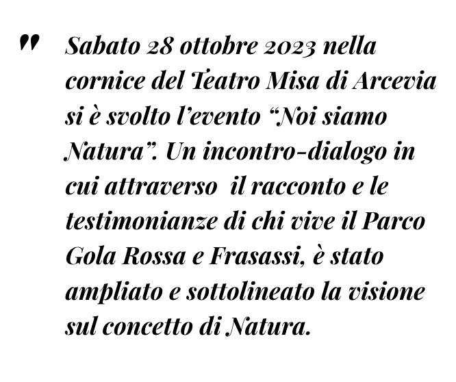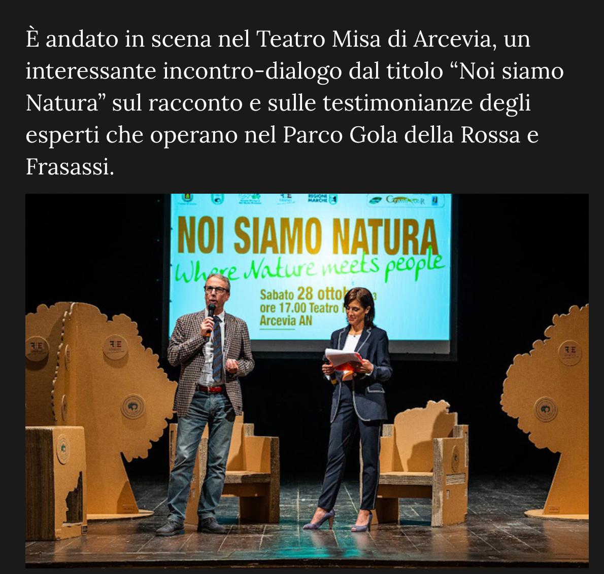 “Noi siamo Natura” è l’affascinante titolo di un incontro-dialogo ambientato nella scenografica cornice del Teatro “Misa” di Arcevia (AN), impostato sul racconto e sulle testimonianze di coloro che operano nel Parco Gola della Rossa e Frasassi.