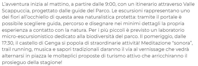 L’avventura inizia al mattino, a partire dalle 9:00, con un itinerario attraverso Valle Scappuccia, progettato dalle guide del Parco. Le escursioni rappresentano uno dei fiori all’occhiello di questa area naturalistica protetta: tramite il portale è possibile scegliere guida, percorso e disegnare nei minimi dettagli la propria esperienza a contatto con la natura. Per i più piccoli è previsto un laboratorio micro-escursionistico dedicato alla biodiversità del parco.