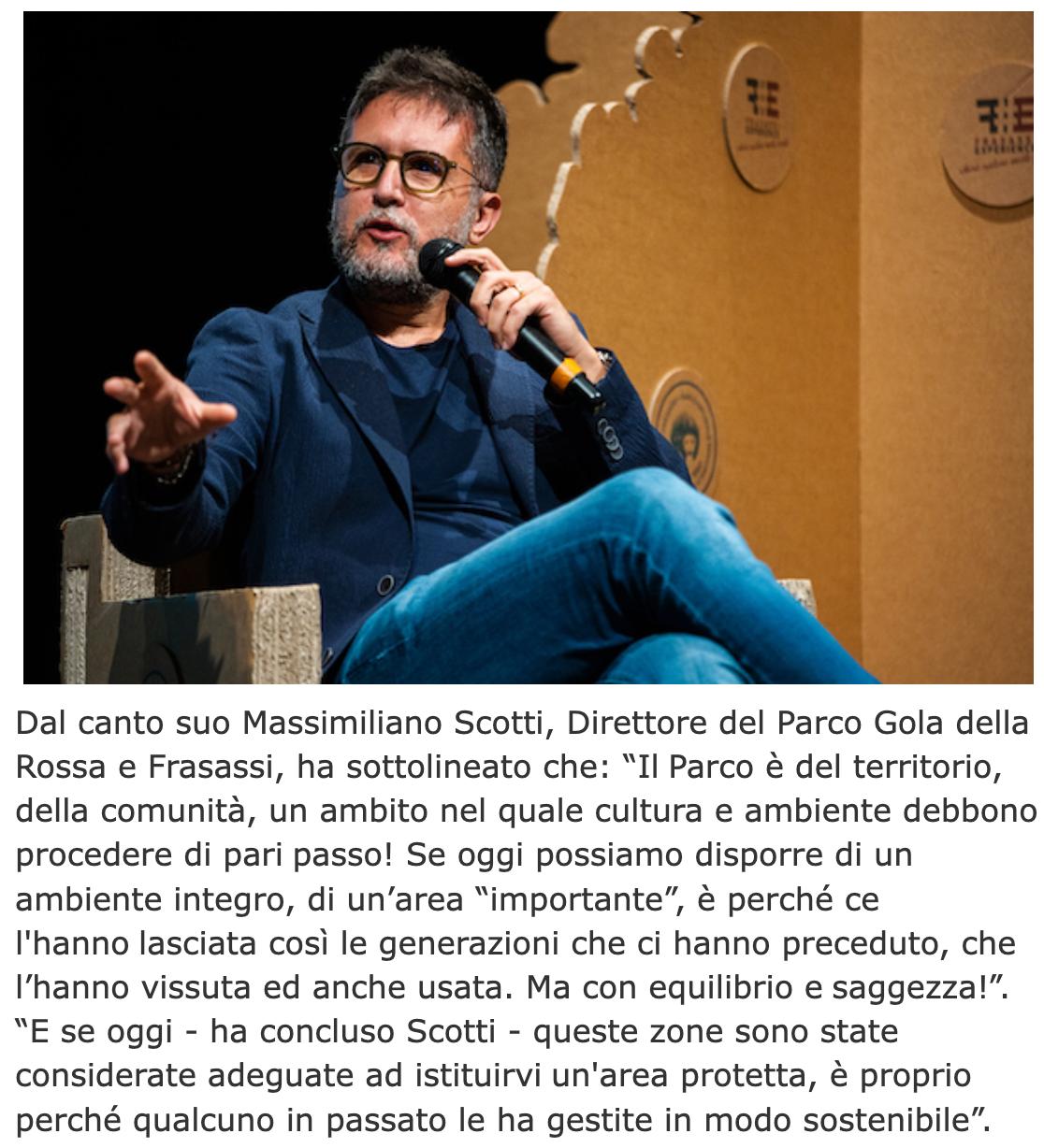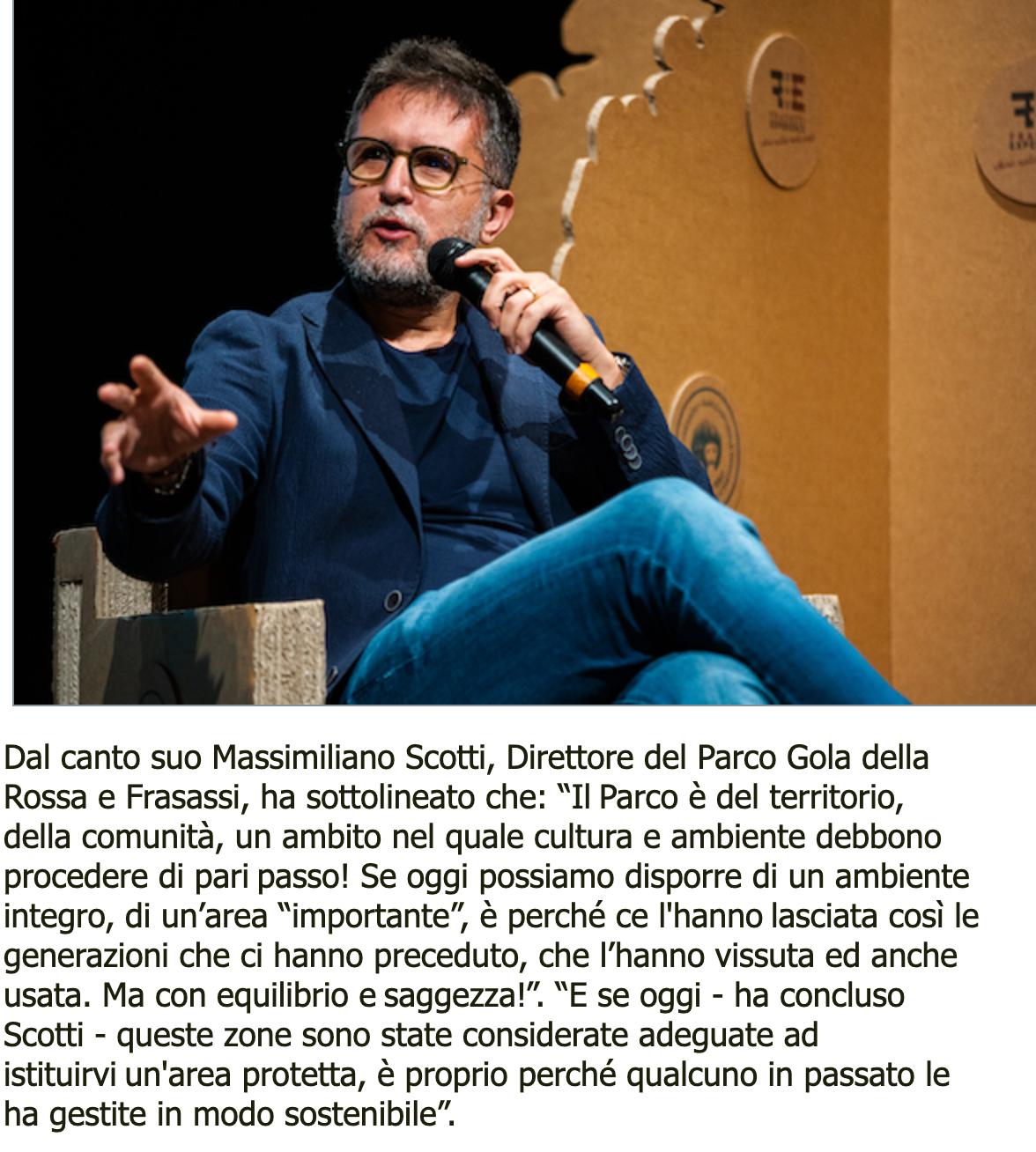 Dal canto suo Massimiliano Scotti, Direttore del Parco Gola della Rossa e Frasassi, ha sottolineato che: “Il Parco è del territorio, della comunità, un ambito nel quale cultura e ambiente debbono procedere di pari passo! Se oggi possiamo disporre di un ambiente integro, di un’area “importante”, è perché ce l'hanno lasciata così le generazioni che ci hanno preceduto, che l’hanno vissuta ed anche usata. Ma con equilibrio e saggezza!”. “E se oggi - ha concluso Scotti - queste zone sono state considerate adeguate ad istituirvi un'area protetta, è proprio perché qualcuno in passato le ha gestite in modo sostenibile”.