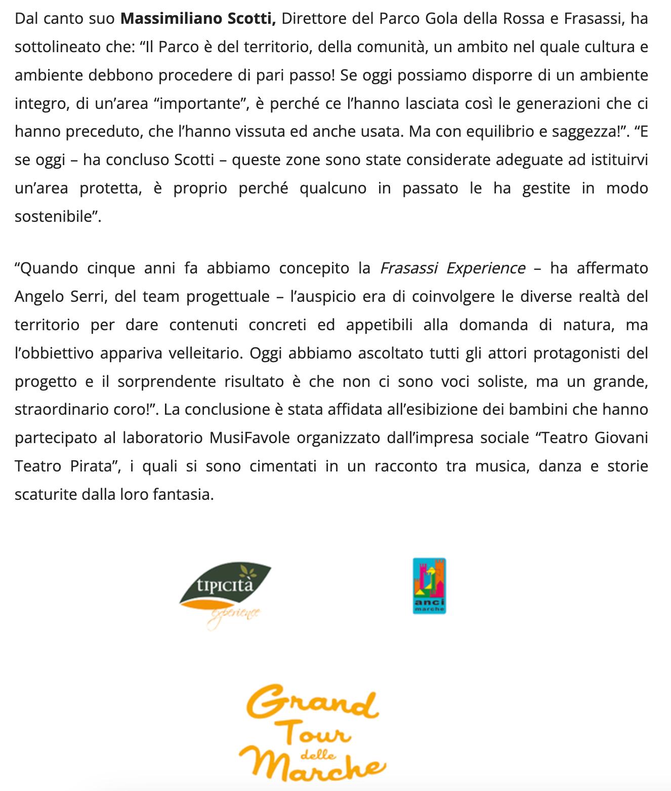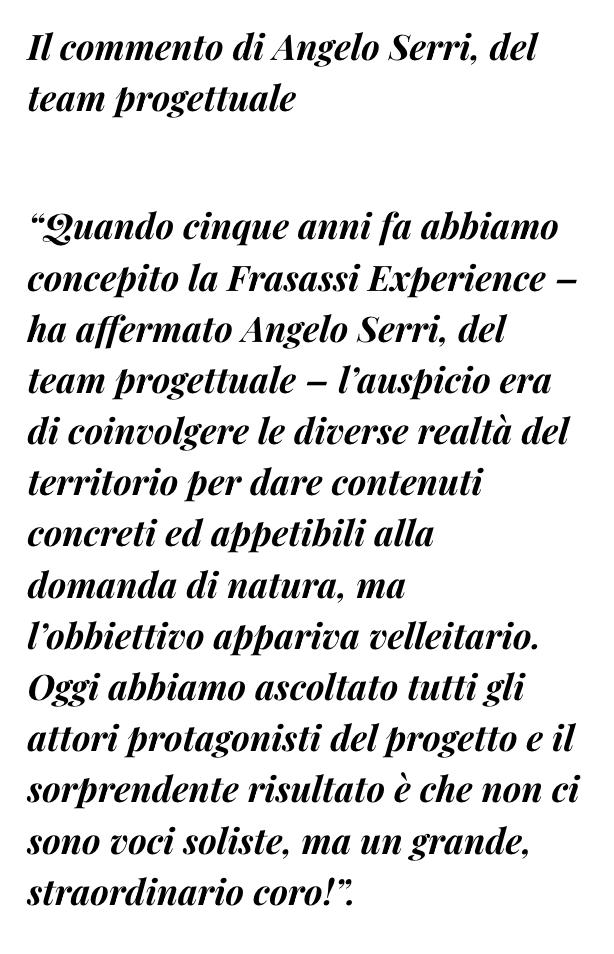 “Quando cinque anni fa abbiamo concepito la Frasassi Experience - ha affermato Angelo Serri, del team progettuale - l’auspicio era di coinvolgere le diverse realtà del territorio per dare contenuti concreti ed appetibili alla domanda di natura, ma l’obbiettivo appariva velleitario. Oggi abbiamo ascoltato tutti gli attori protagonisti del progetto e il sorprendente risultato è che non ci sono voci soliste, ma un grande, straordinario coro!”.