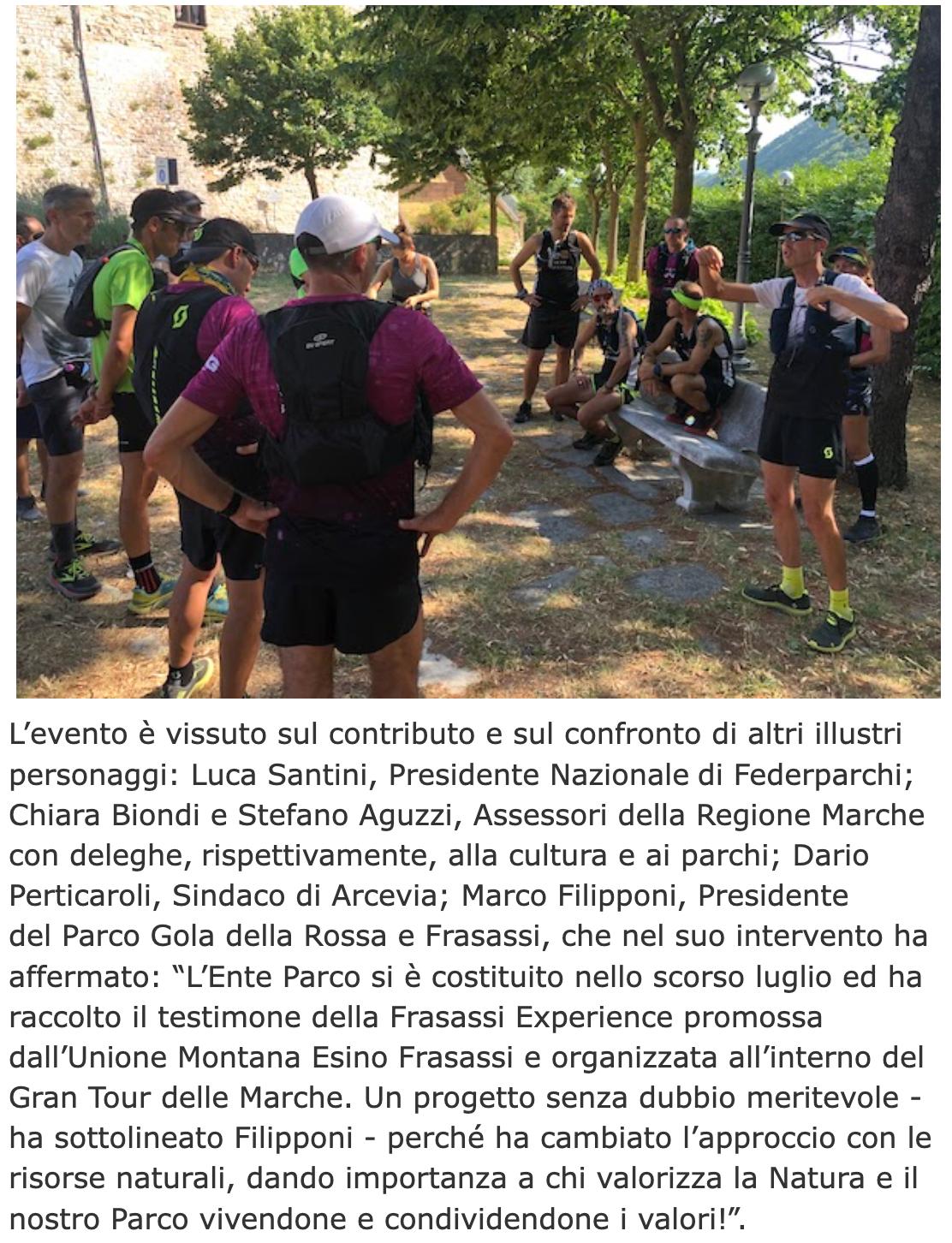 L’evento è vissuto sul contributo e sul confronto di altri illustri personaggi: Luca Santini, Presidente Nazionale di Federparchi; Chiara Biondi e Stefano Aguzzi, Assessori della Regione Marche con deleghe, rispettivamente, alla cultura e ai parchi; Dario Perticaroli, Sindaco di Arcevia; Marco Filipponi, Presidente del Parco Gola della Rossa e Frasassi, che nel suo intervento ha affermato: “L’Ente Parco si è costituito nello scorso luglio ed ha raccolto il testimone della Frasassi Experience promossa dall’Unione Montana Esino Frasassi e organizzata all’interno del Gran Tour delle Marche. Un progetto senza dubbio meritevole - ha sottolineato Filipponi - perché ha cambiato l’approccio con le risorse naturali, dando importanza a chi valorizza la Natura e il nostro Parco vivendone e condividendone i valori!”.
