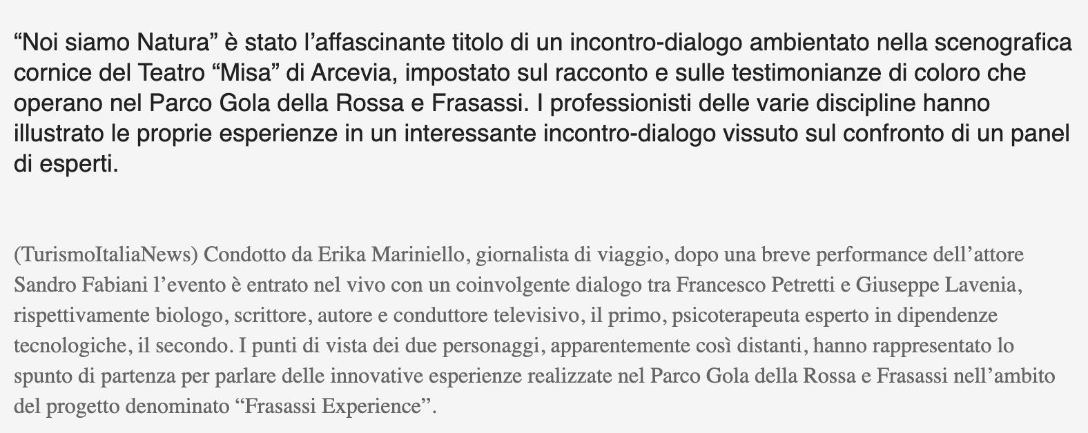 Condotto da Erika Mariniello, giornalista di viaggio, dopo una breve performance dell’attore Sandro Fabiani l’evento è entrato nel vivo con un coinvolgente dialogo tra Francesco Petretti e Giuseppe Lavenia, rispettivamente biologo, scrittore, autore e conduttore televisivo, il primo, psicoterapeuta esperto in dipendenze tecnologiche, il secondo. I punti di vista dei due personaggi, apparentemente così distanti, hanno rappresentato lo spunto di partenza per parlare delle innovative esperienze realizzate nel Parco Gola della Rossa e Frasassi nell’ambito del progetto denominato “Frasassi Experience”