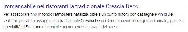 Per assaporare fino in fondo l'atmosfera natalizia, oltre a un punto ristoro con castagne e vin brulè, i visitatori potranno assaggiare- la tradizionale Crescia DE.C.O., gustosa spet:ialil:à di Frontone disponibile nei numerosi ristoranti del paese. Con i mercatini s'inizia alle 11:00, mentre a partire dalle 16:00, nelle suggestive vie che percorrono il borgo adagiato ai piedi del Castello, inizia un gran movimento con tantissime attrazioni: giochi, musica e artisti di strada che animano la serata, insieme a uno spettacolo di sculture sul ghiaccio e alle scene del Presepe vivente di Paravento di Cagli. Per domenica 11 dicembre è previsto l'appuntamento conclusivo dell'iniziativa "Nel Castello di Babbo Natale".