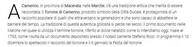 La manifestazione, iniziata il quattro scorso, prevede altre due giornate dense di eventi, giovedì 8 e domenica 11 dicembre, che propongono un emozionante itinerario attraverso il borgo per grandi e bambini, tra arte, cultura e sapori delle All:e Marche. Tra le antiche mura castellane si potranno acquistare specialità gastronomiche, oggettistica, manufatti realizzati dagli artigiani clel territorio e pregia · prodotti proposti dagli agricoltori locali, ma sarà anche possibile partecipare a laboratori creativi di ceramica e decorazione per bambini che, tra l'altrn, potranno oolloquiare con Babbo Nat.ale in persona!