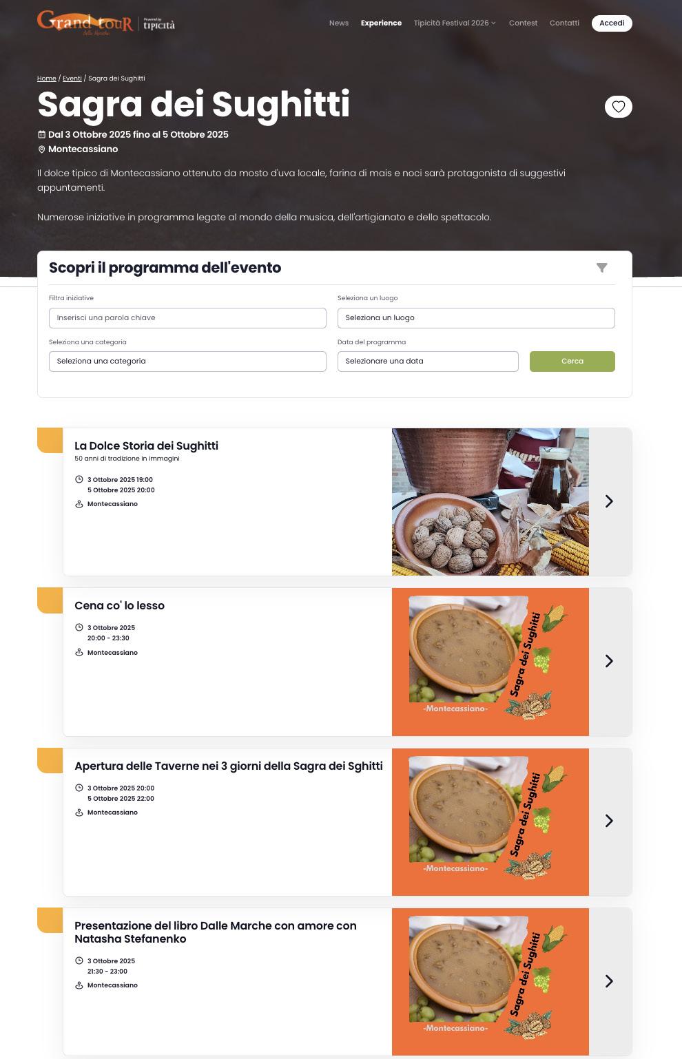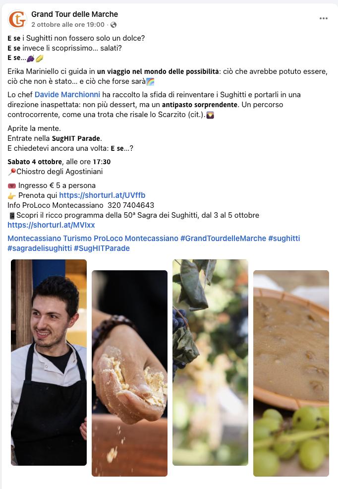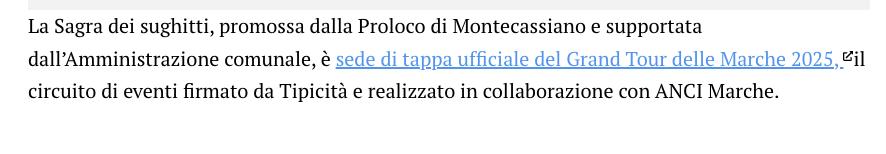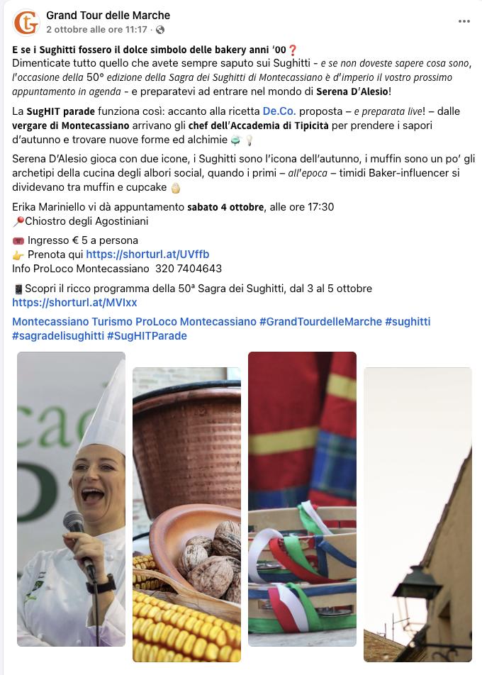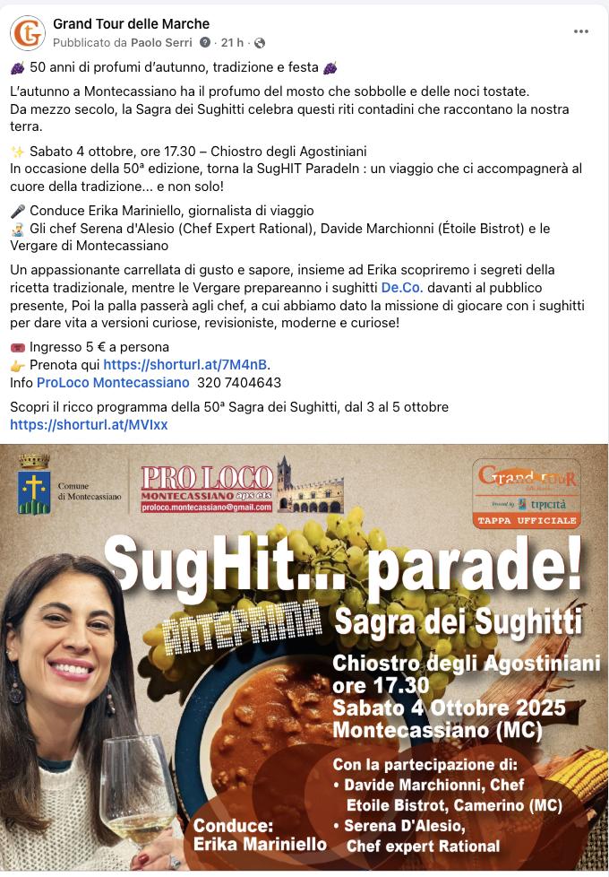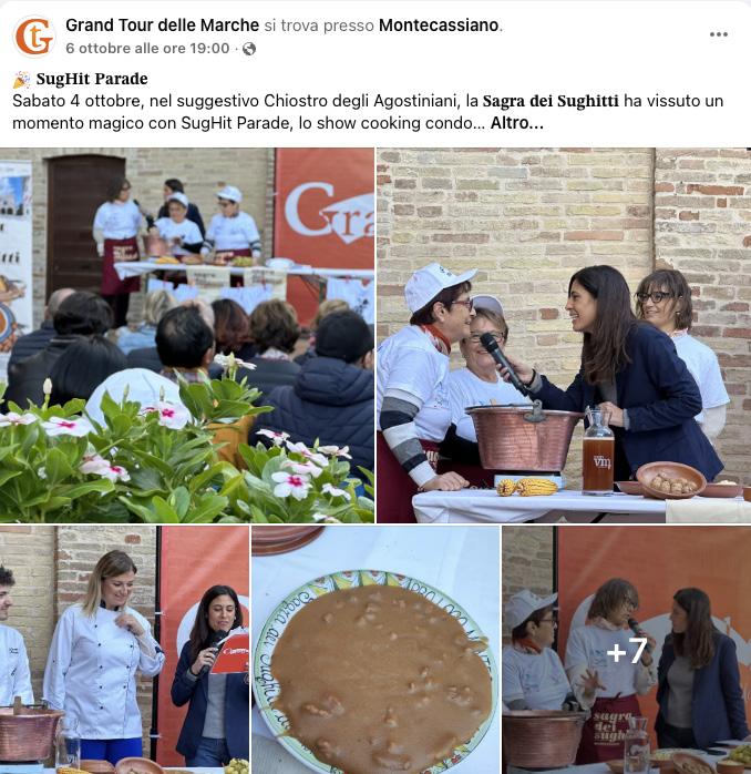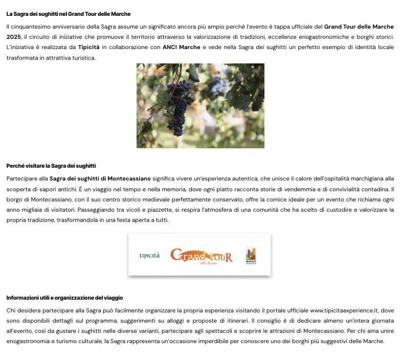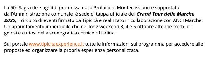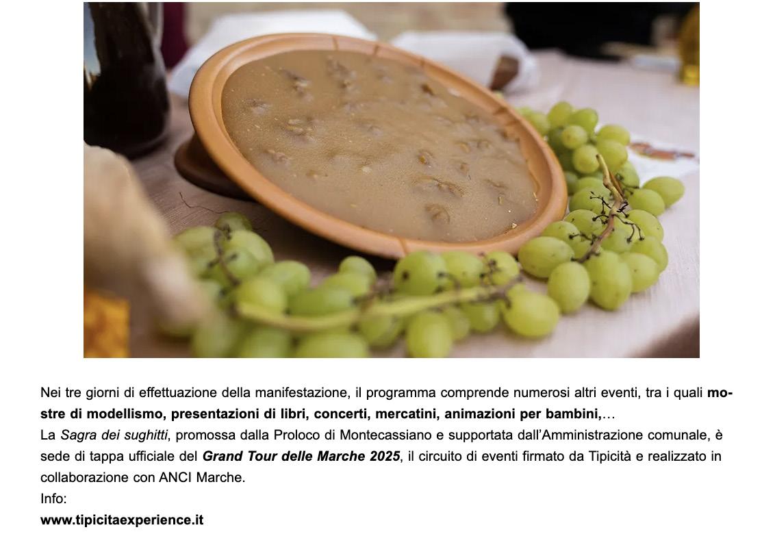 La Sagra dei sughitti, promossa dalla Proloco di Montecassiano e supportata dall’Amministrazione comunale, è sede di tappa ufficiale del Grand Tour delle Marche 2025, il circuito di eventi firmato da Tipicità e realizzato in collaborazione con ANCI Marche.