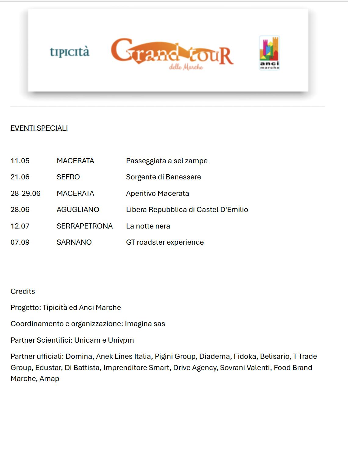 Tra gli eventi speciali, la passeggiata a sei zampe a Macerata, Sorgenti di Benessere a Sefro e poi gli speciali “Aperitivi”, di nuovo a Macerata. Da segnalare, il 28 giugno, l’evento “Libera Repubblica di Castel d’Emilio ad Agugliano”, uno spaccato di tradizioni e gusti veneti che rende omaggio al Grand Tour delle Marche. La notte nera a Serrapetrona e la GT roadster experience Mazda a Sarnano sono gli altri eventi speciali in calendario.
