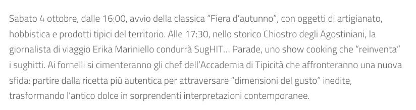 Sabato 4 ottobre, dalle 16:00, avvio della classica “Fiera d’autunno”, con oggetti di artigianato, hobbistica e prodotti tipici del territorio. Alle 17:30, nello storico Chiostro degli Agostiniani, la giornalista di viaggio Erika Mariniello condurrà SugHIT Parade, uno show cooking che “reinventa” i sughitti. Ai fornelli si cimenteranno gli chef dell’Accademia di Tipicità che affronteranno una nuova sfida: partire dalla ricetta più autentica per attraversare “dimensioni del gusto” inedite, trasformando l’antico dolce in sorprendenti interpretazioni contemporanee.