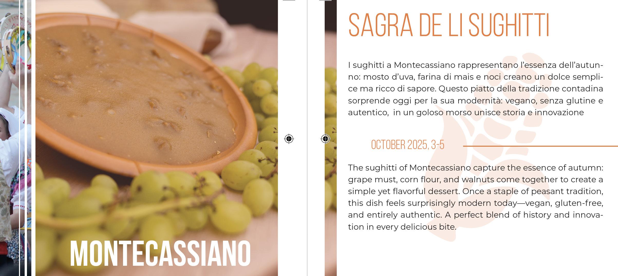 Nel long weekend 3, 4 e 5 ottobre, a Montecassiano (MC), si celebra il cinquantesimo anniversario della Sagra dei Sughitti, una storica manifestazione che s’inserisce nei tradizionali riti legati alla raccolta dell’uva ed alla vendemmia. Li sughitti, infatti, sono gustosi dolci autunnali tipici del maceratese, che hanno nel mosto d’uva il principale ingrediente, insieme a farina di mais e noci, e che trovano in questa incantevole località, uno dei Borghi più Belli d’Italia e Bandiera Arancione, il luogo d’adozione per eccellenza. Non a caso, infatti, Montecassiano ha riconosciuto questa specialità gastronomica con la De.Co. (Denominazione comunale).
