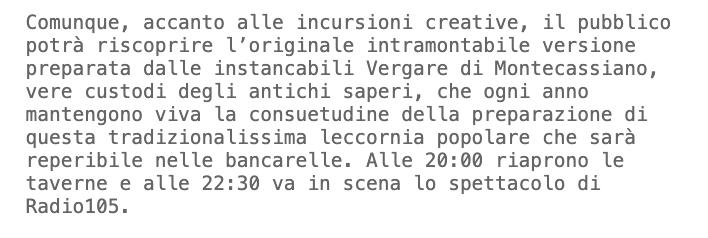 Comunque, accanto alle incursioni creative, il pubblico potrà riscoprire l’originale intramontabile versione preparata dalle instancabili Vergare di Montecassiano, vere custodi degli antichi saperi, che ogni anno mantengono viva la consuetudine della preparazione di questa tradizionalissima leccornia popolare che sarà reperibile nelle bancarelle. Alle 20:00 riaprono le taverne e alle 22:30 va in scena lo spettacolo di Radio105.