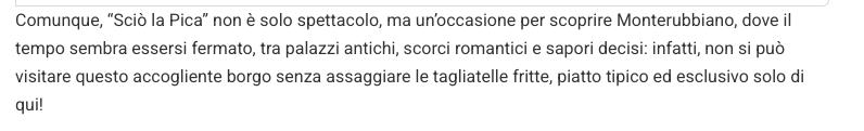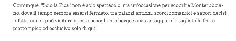 Comunque, “Sciò la Pica” non è solo spettacolo, ma un’occasione per scoprire Monterubbiano, dove il tempo sembra essersi fermato, tra palazzi antichi, scorci romantici e sapori decisi: infatti, non si può visitare questo accogliente borgo senza assaggiare le tagliatelle fritte, piatto tipico ed esclusivo solo di qui!