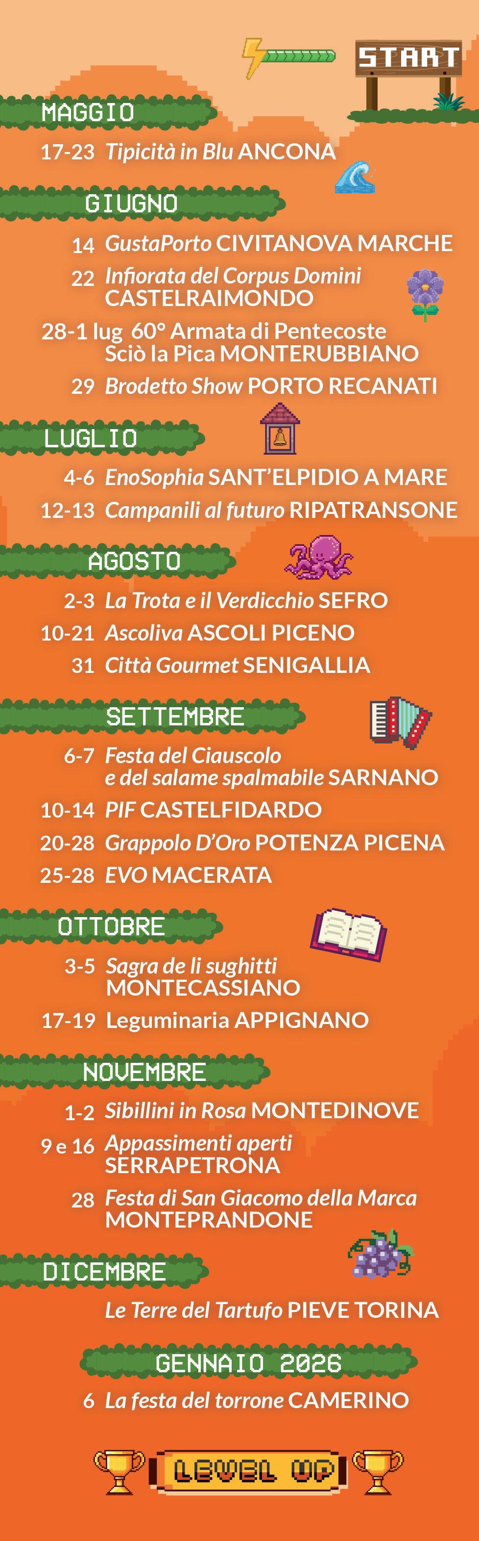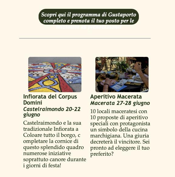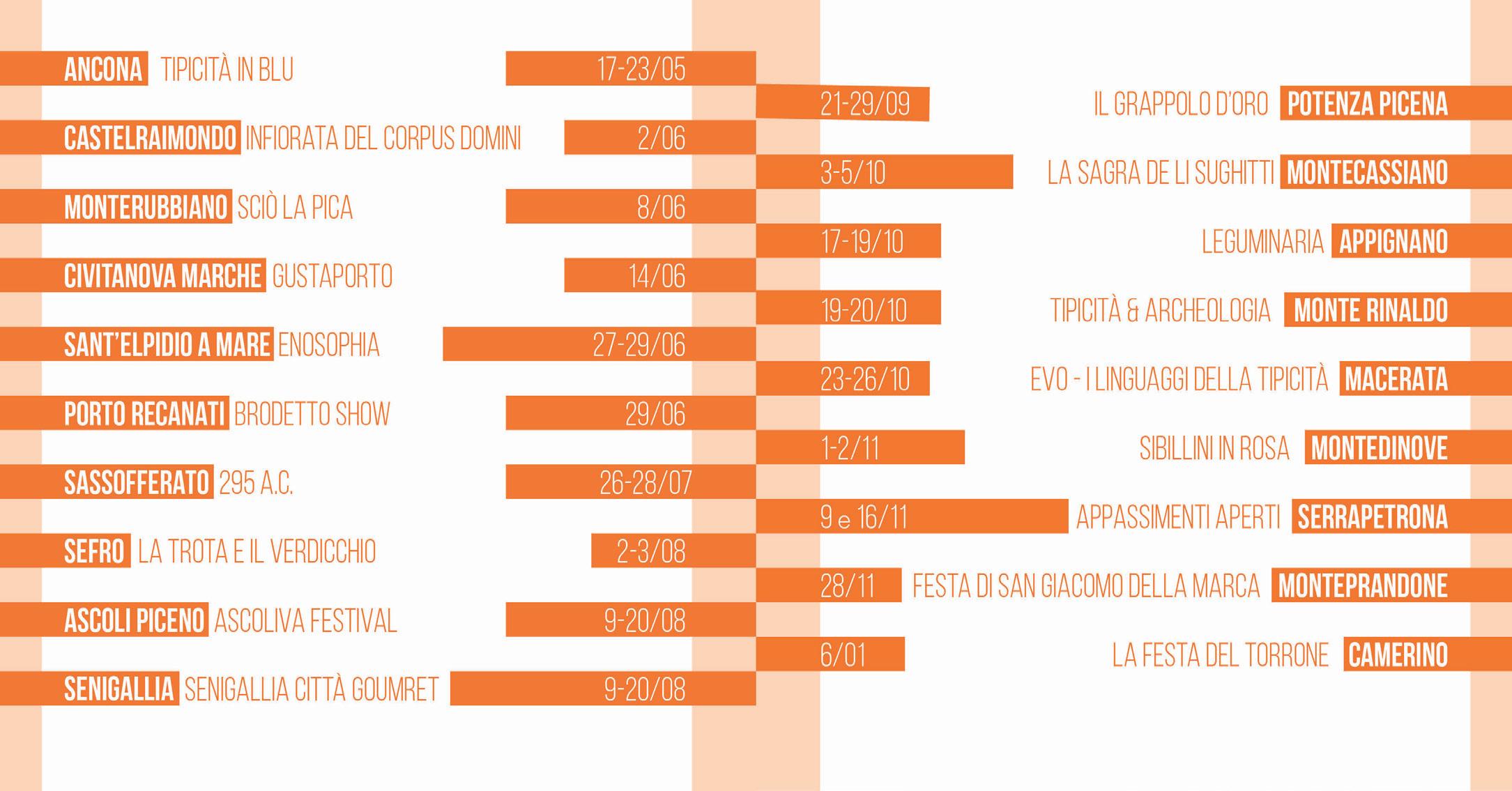 Dopo il prologo di Tipicità Festival a Fermo nel marzo scorso, a maggio è di scena Tipicità in Blu ad Ancona, mentre giugno si presenta con GustaPorto a Civitanova Marche e l’Infiorata di Castelraimondo. A chiudere il mese che dà avvio all’estate, Monterubbiano con Sciò la Pica e Porto Recanati con Brodetto Show.